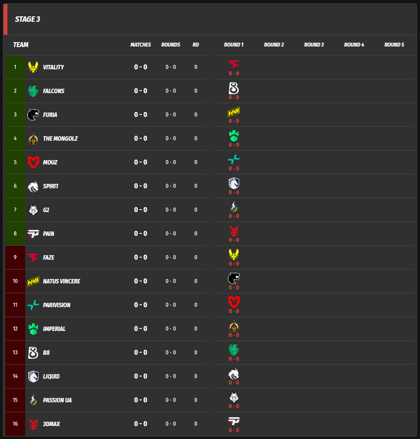 Bagan turnamen tahap ketiga dibagi menjadi dua bagian. Delapan tim pertama — FURIA Esports, Vitality, Falcons, The MongolZ, MOUZ, Spirit, G2 dan paiN Gaming — langsung diundang oleh penyelenggara, melewati dua tahap pertama. Delapan tempat lainnya diperebutkan dalam persaingan ketat: Natus Vincere, FaZe, B8, Imperial, PARIVISION, Liquid, Passion UA dan 3DMAX berhasil masuk ke 16 besar di akhir tahap kedua.