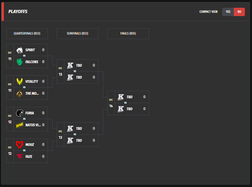 Berdasarkan hasil tahap ini, tim-tim berikut melaju ke playoff: Spirit, FURIA, MOUZ, Vitality, The MongolZ, FaZe, Natus Vincere dan Falcons. Mereka akan melanjutkan perjuangan untuk gelar dan bagian terbesar dari hadiah sebesar $1.250.000 di tahap akhir, yang akan berlangsung dari 11 hingga 14 Desember di MVM Dome.